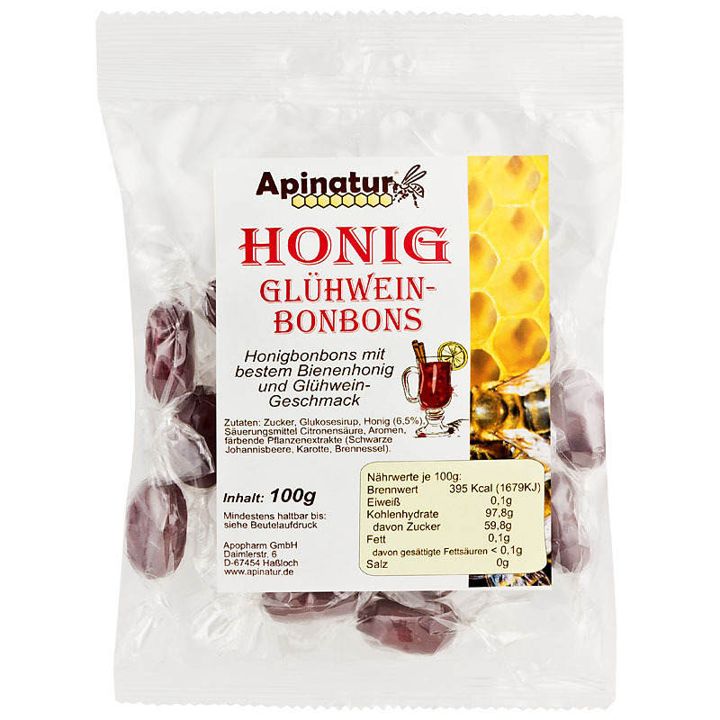 Leckeres Honig-Bonbon mit Glühweinaroma, einzeln in Klarsichtfolie gewickelt, 100g Beutel, etikettiert. Garantiert ohne Alkohol.