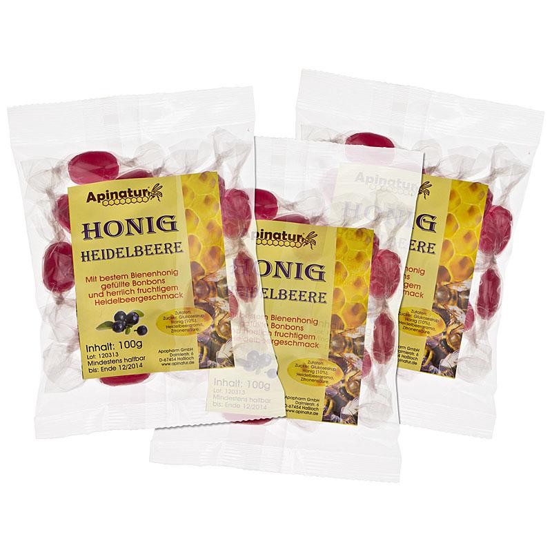 Gefüllte Honigbonbons mit fruchtig leckerem Heidelbeergeschmack, 100g Beutel, etikettiert.